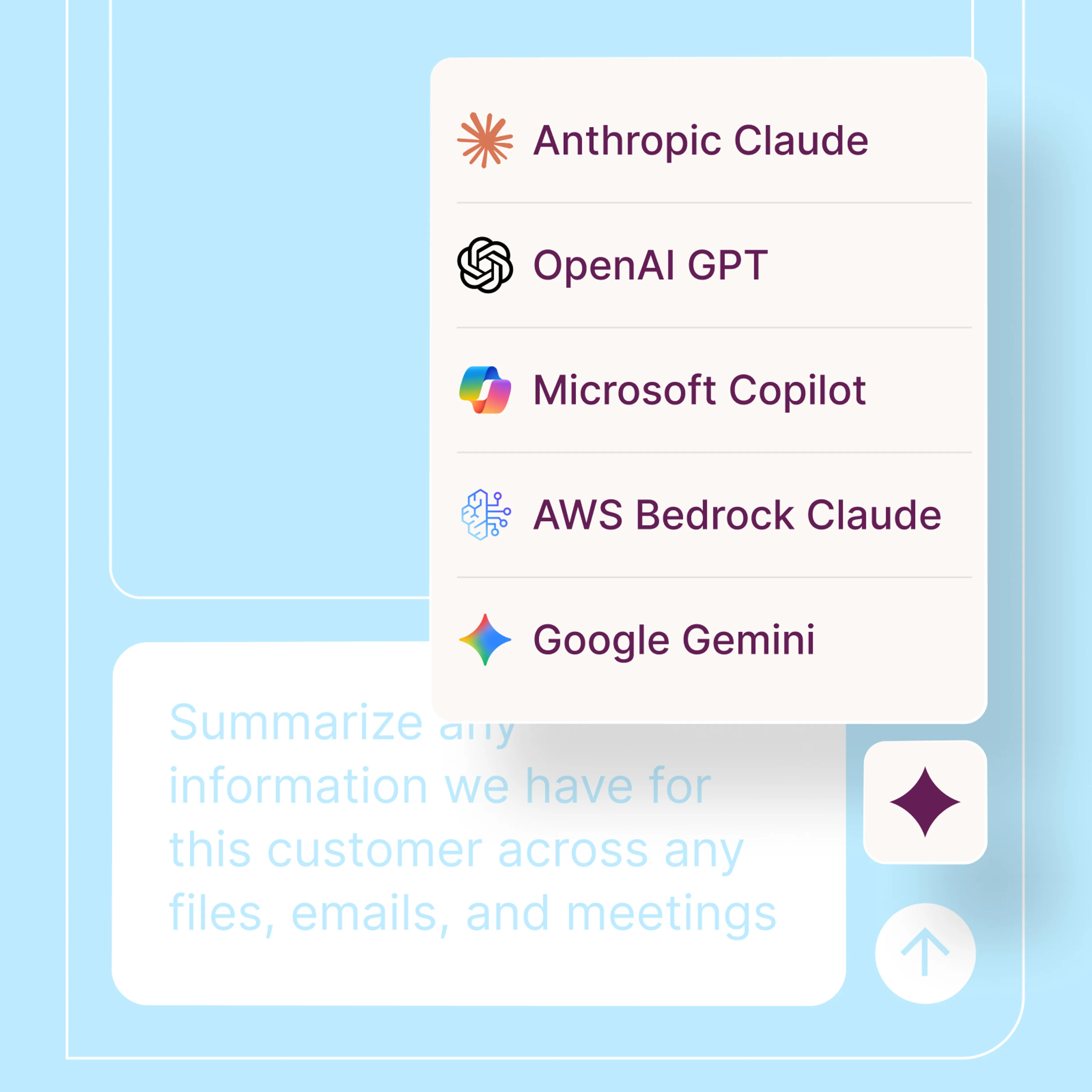 Work with any AI model - Anthropic Claude, OpenAI GPT, Azure GPT, AWS Bedrock, Google Gemini or your own proprietary models. Switch seamlessly based on your needs without changing workflows.